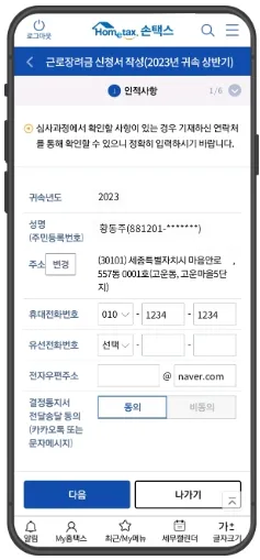 로그인 > 세무업무별 서비스 > 근로, 자녀장려금 > 반기신청 > 신청하기 > 인적사항작성 > 소득명세 작성 > 전세금명세 작성 > 계좌번호 작성 > 신청확인 및 전송